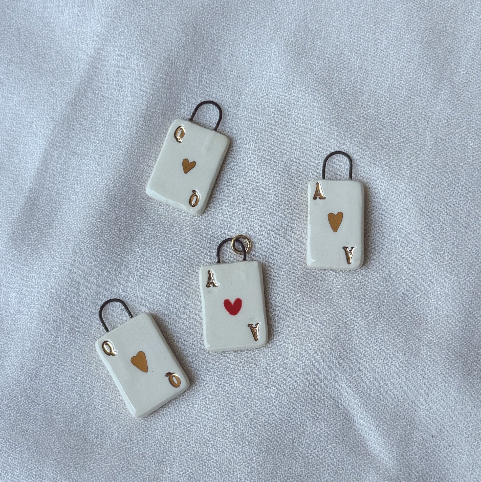Tiny playing card ceramic charms in Ace of Hearts and Queen of Hearts designs! These are perfect for charm necklaces, bracelets, or anklets. Each charm is handmade and hand-painted from porcelain clay and pastel glazes to create a unique and adorable keepsake or the perfect present!
